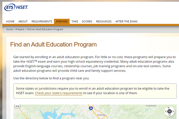 Use this website to find an Adult Education Programs that offer the HiSET.