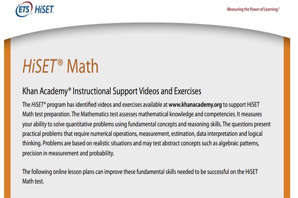 Khan Academy has many support videos to help with test prep for the HiSET.